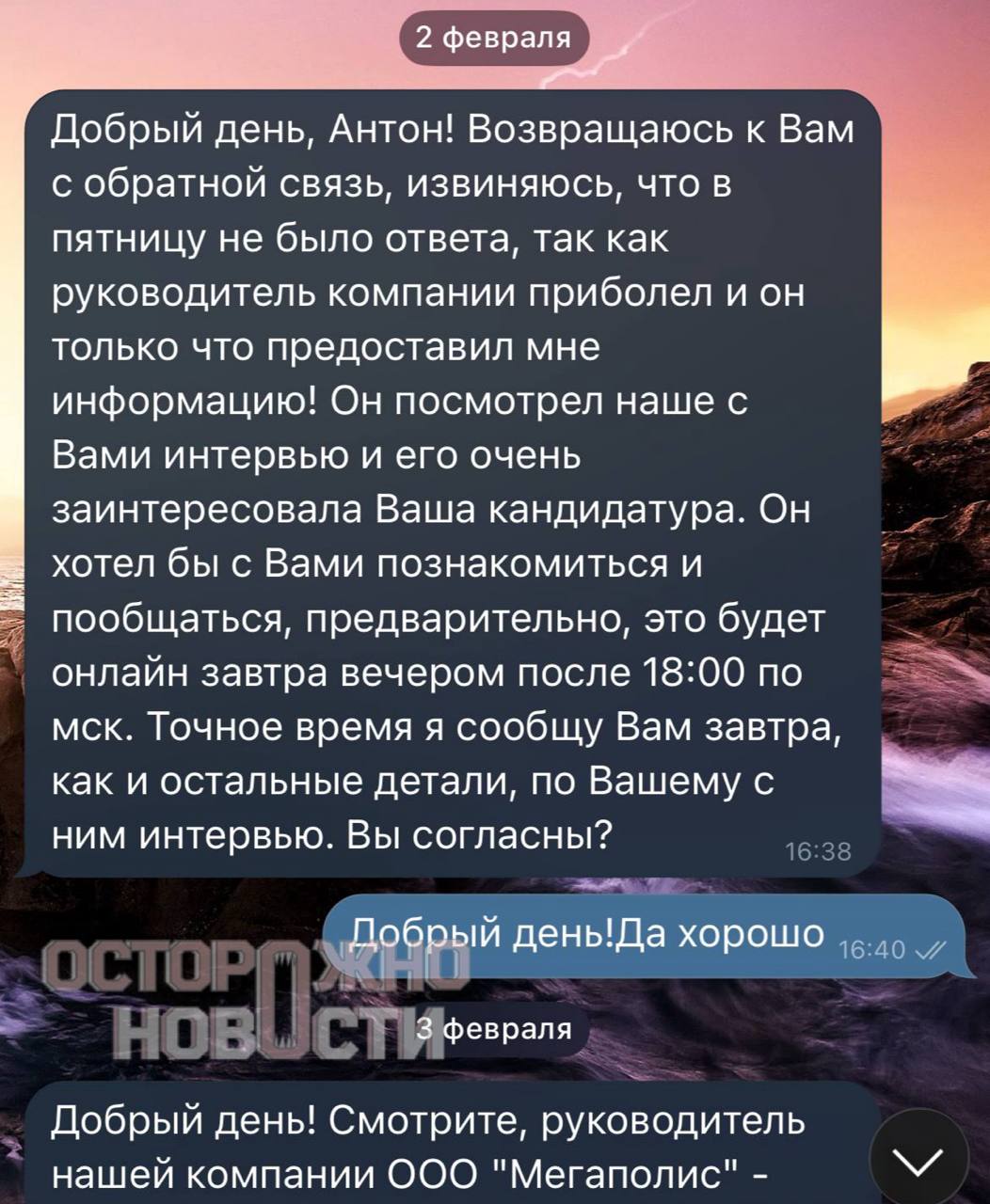 Через сутки Антону предложили выйти на испытательный срок с окладом в 300 тысяч рублей. Менеджер прислала договор с настоящими реквизитами и ФИО гендиректора «Мегаполиса». Также от Антона потребовали копии паспорта, СНИЛС, ИНН и банковские реквизиты. Мужчина заподозрил обман и предложил привезти документы лично в краснодарский офис компании. В ответ менеджер назвала его «идиотом» и заблокировала. Сейчас вакансия находится в архиве, а страница рекрутера удалена.