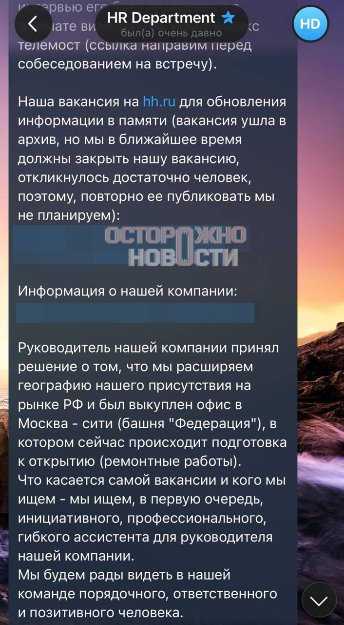 Житель Москвы Антон откликнулся на вакансию личного помощника с зарплатой в 400 тысяч рублей на сайте HH.ru. С ним связалась девушка в Telegram, представившаяся HR-менеджером компании ООО «Мегаполис», зарегистрированной в Краснодаре. Она сообщила, что организация выкупила офис в башне «Федерация» в Москва-Сити, где сейчас идёт ремонт.