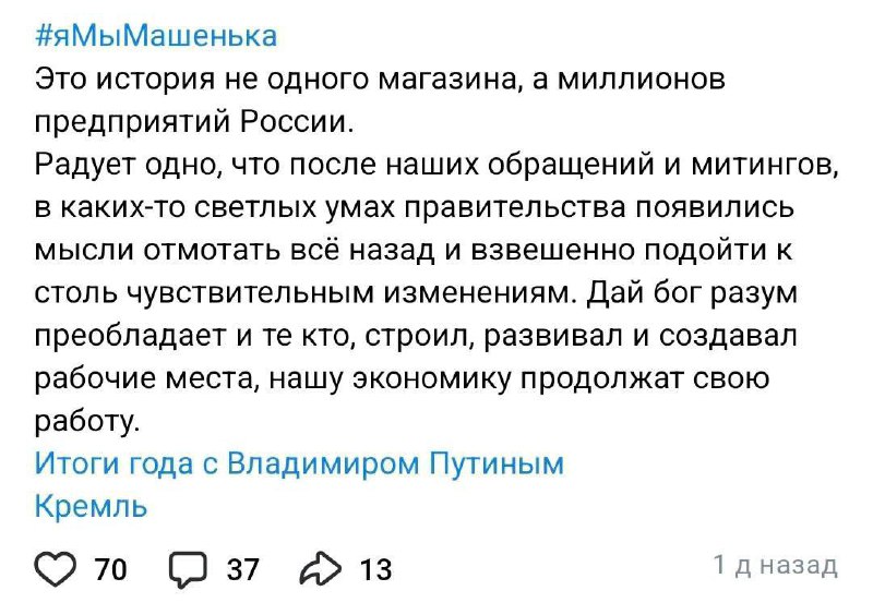 Ситуация в малом бизнесе продолжает ухудшаться, и флешмоб «Я/мы Машенька» стал символом борьбы за выживание. Предприниматели надеются, что их голос будет услышан, и власти примут меры для стабилизации ситуации.