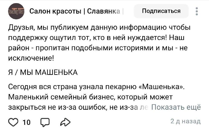 Российские предприниматели запустили флешмоб «Я/мы Машенька», чтобы привлечь внимание к кризису в малом бизнесе. Инициатором акции выступила Ассоциация предприятий индустрии красоты, вдохновленная историей подмосковной пекарни «Машенька». Владелец пекарни обратился к президенту Владимиру Путину с предупреждением о возможном закрытии из-за резкого роста налогов и подорожания патентов.
