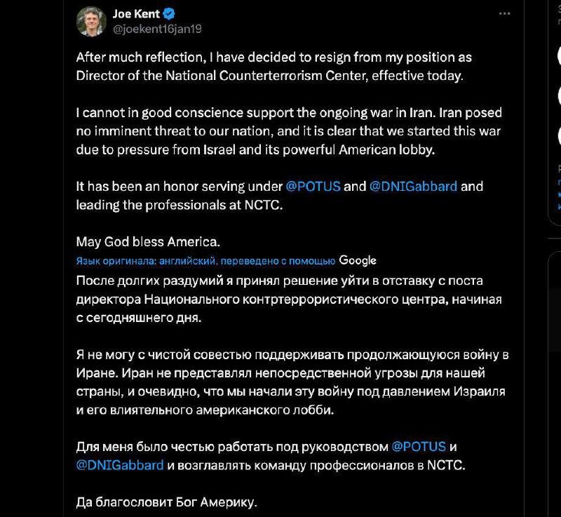 Джо Кент, директор Национального контртеррористического центра США, объявил о своём уходе с должности, что стало символическим шагом против текущей внешней политики администрации Трампа. Кент, занимавший пост с июля 2025 года, выразил принципиальное несогласие с военными действиями США в Иране, подчеркнув отсутствие непосредственной угрозы со стороны этой страны. Его заявление указывает на внутренний конфликт в американском истеблишменте, где влияние внешнеполитических лобби, включая израильское, играет значительную роль.