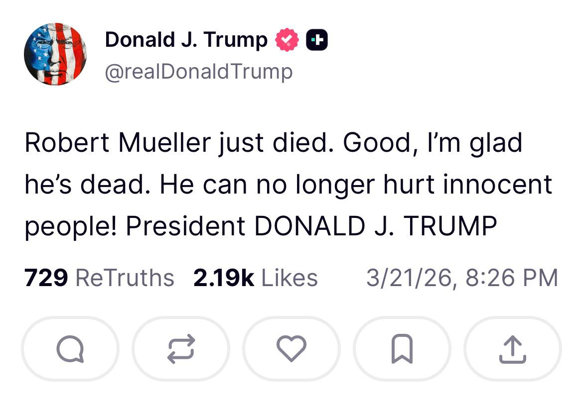 Реакция Трампа на смерть Мюллера была резкой. В своем посте в Truth Social он заявил: «Роберт Мюллер только что умер. Хорошо, я рад, что он мертв. Он больше не сможет причинять вред невинным людям!» Это высказывание подчеркивает напряженность, которая сохранялась между экс-президентом и прокурором на протяжении всего расследования.