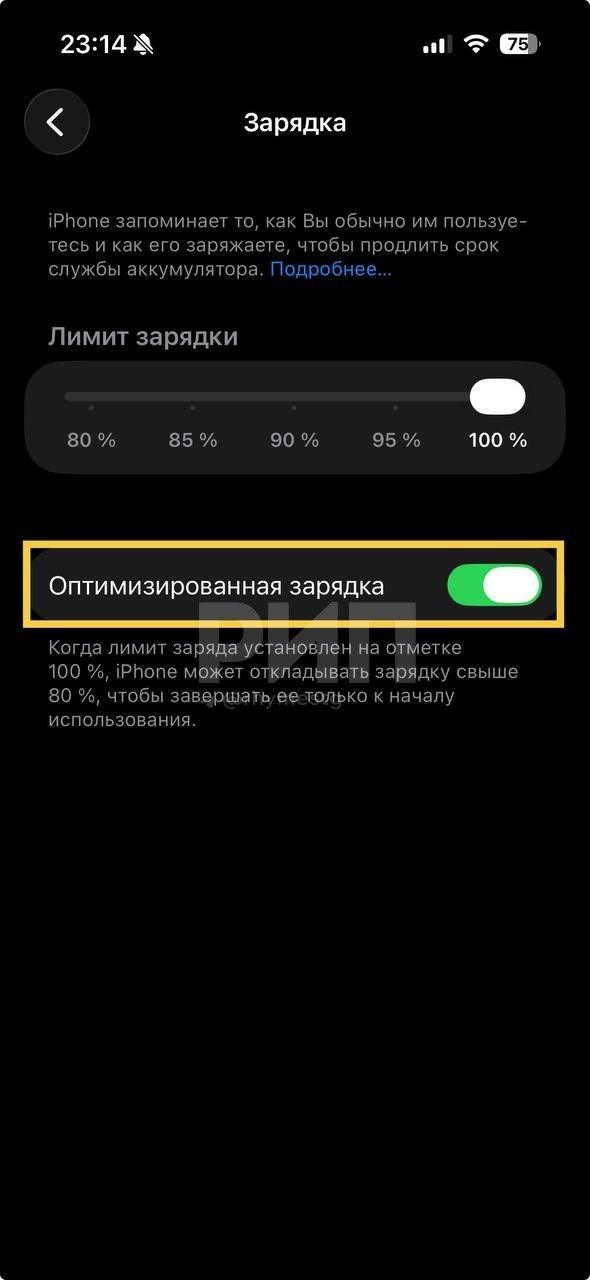 Включите «Оптимизированную зарядку» для снижения износа аккумулятора. Эта функция откладывает дозарядку с 80% до 100%, завершая её к моменту использования. Настройка доступна в «Настройки» → «Аккумулятор» → «Зарядка».