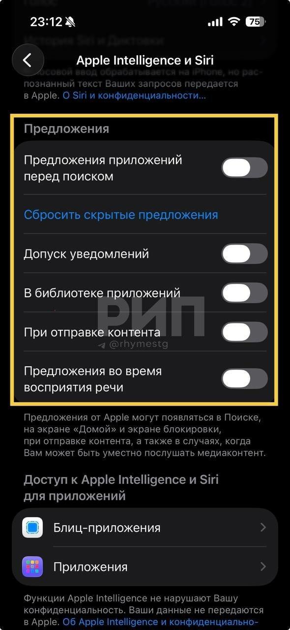 Apple Intelligence и Siri могут значительно нагружать аккумулятор, особенно если функции предлагают подсказки и предложения в фоне. Откройте «Настройки» → «Apple Intelligence и Siri» → «Предложения» и отключите всё, что вам не нужно.