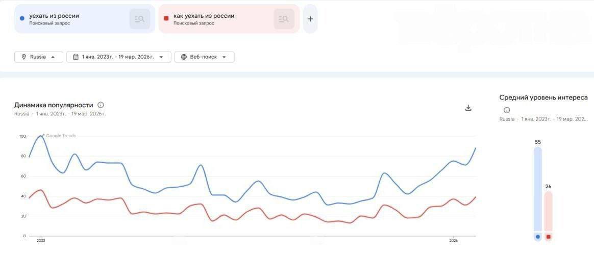Россияне в панике штурмуют поисковики: запросы про «как уехать» взлетели до небес. После внезапных блокировок и массовых отключений интернета народ рванул гуглить пути отступления — индекс эмиграционных настроений подскочил до 88 баллов. Это всего на 12 пунктов ниже рекорда мобилизационного ужаса-2022, когда страну лихорадило от военкоматовских повесток.