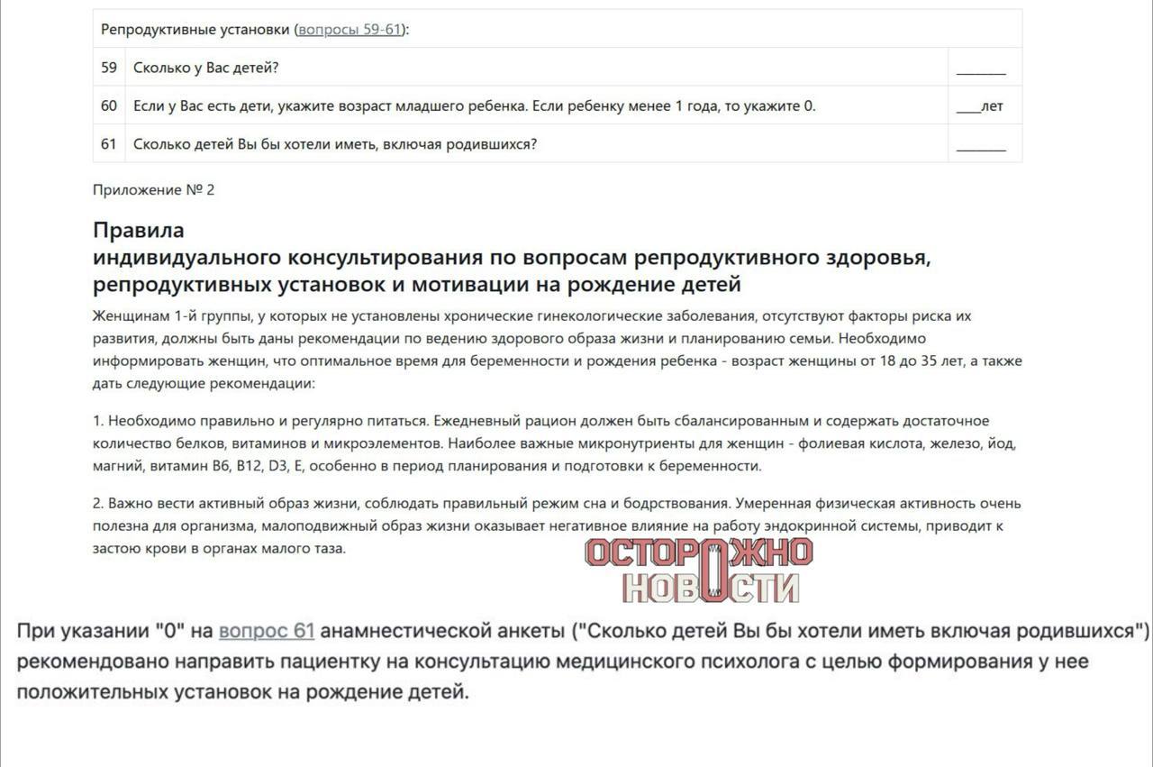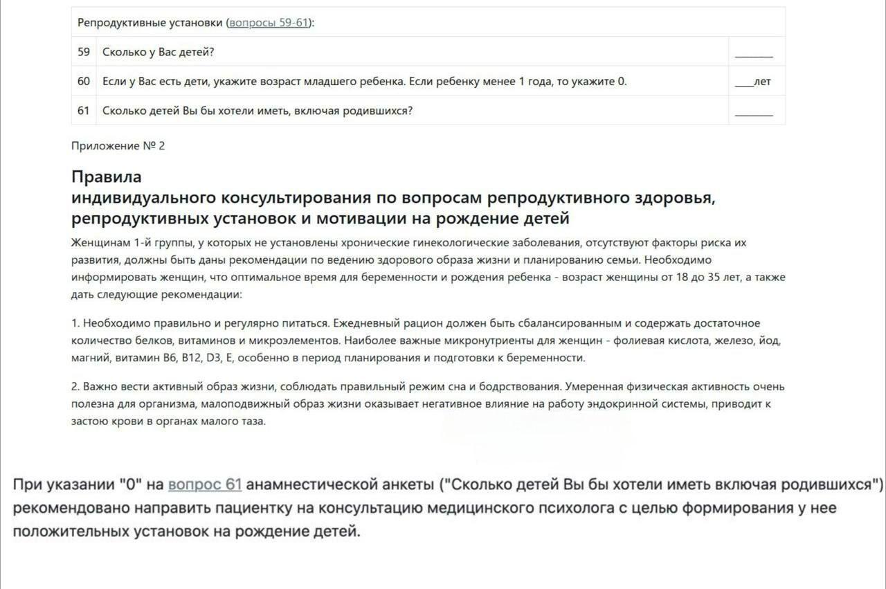 Документ, который утвердили в ведомстве, предусматривает анкету с вопросом: «Сколько детей вы бы хотели иметь, включая уже рождённых?» Если ответ — ноль, то медицинский психолог ждёт тебя с распростёртыми объятиями. Цель — поменять твоё мнение. Звучит как сценарий из антиутопии, но это реальность.