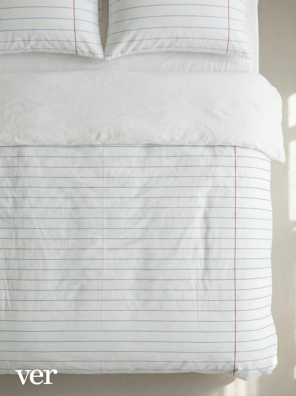 Российский бренд Verlab представил коллекцию постельного белья, вдохновленную школьными тетрадями. Простыня — в линейку, пододеяльник — зеленая обложка. Ностальгия или кошмар? 🤔