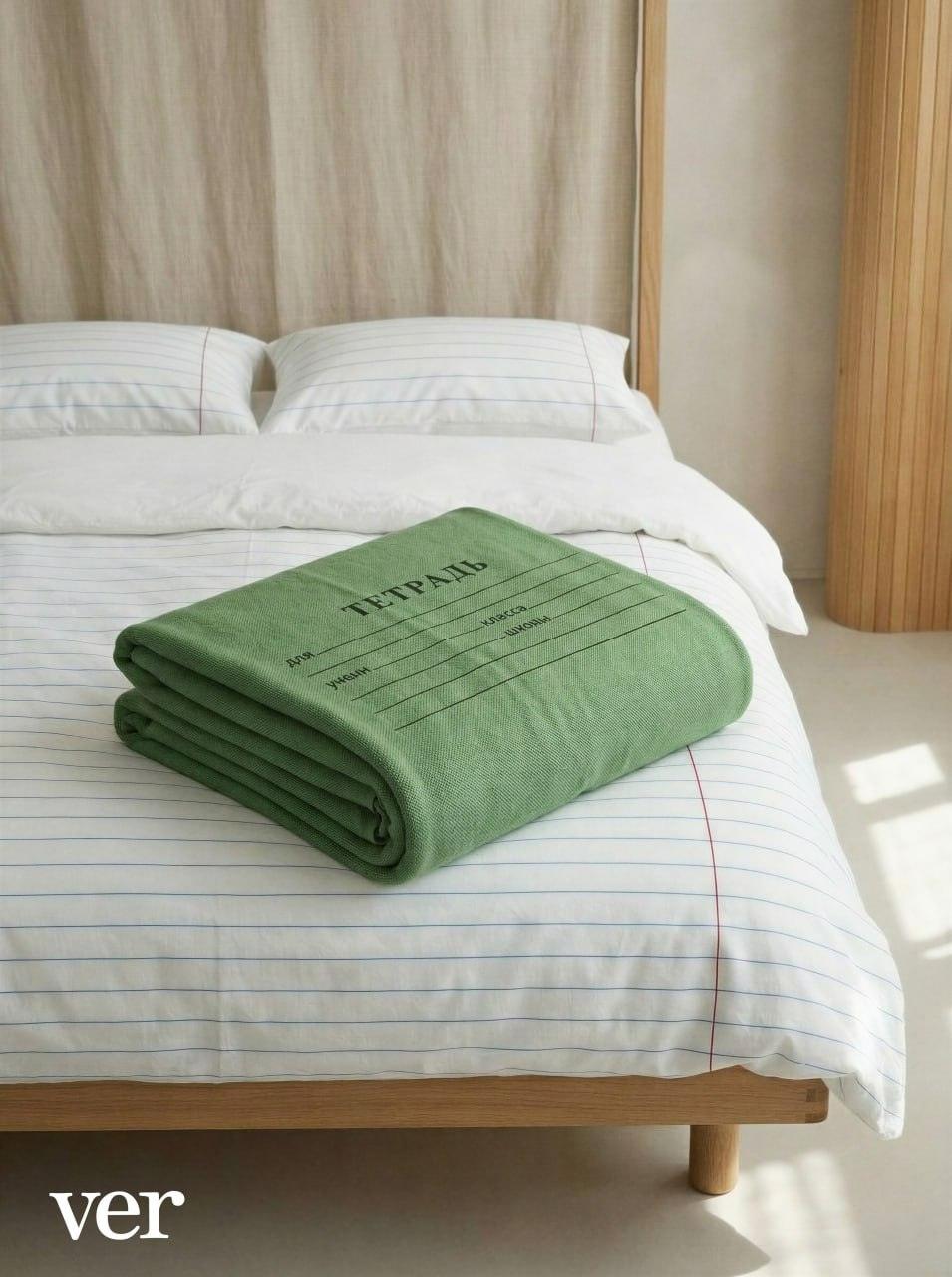 Школьники и не только, внимание! Российский бренд Verlab решил вернуть вас в школьные годы, но не на уроки, а в постель. 🛏️📓 Они выпустили коллекцию постельного белья, которая выглядит как школьная тетрадь. Простыня — это лист в линейку, а пододеяльник — та самая зеленая обложка, которую все помнят.