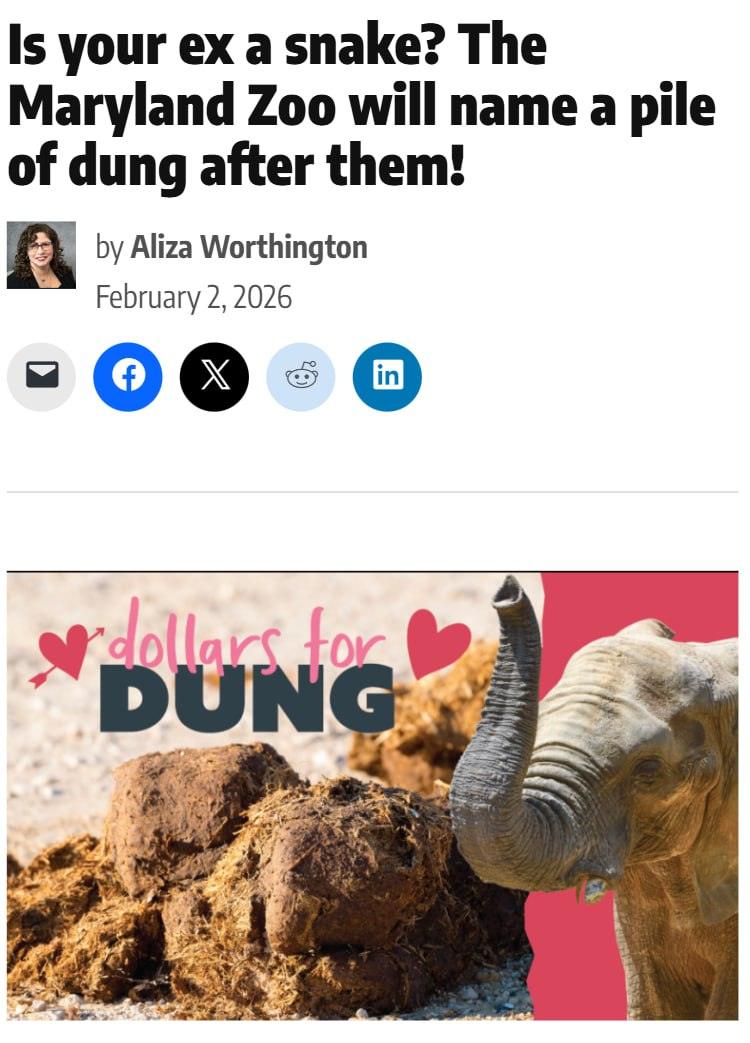 Зоопарк Мэриленда решил добавить перчинки в День святого Валентина. Теперь за донат в $5 они предлагают назвать свежую кучу навоза именем вашего бывшего и отправить вам сертификат с фоткой и подписью. 🐘💩