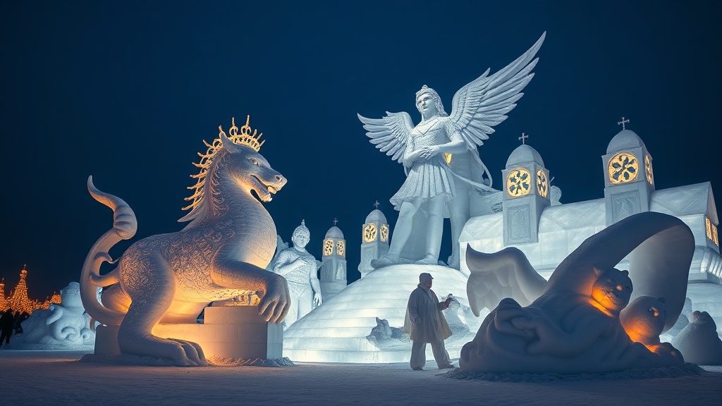 Фигуры поражают разнообразием: от мифических существ до современных абстракций. Каждая работа уникальна, и каждая заставляет остановиться и восхититься. Это не просто снеговики — это полноценные произведения искусства, созданные руками профессионалов.