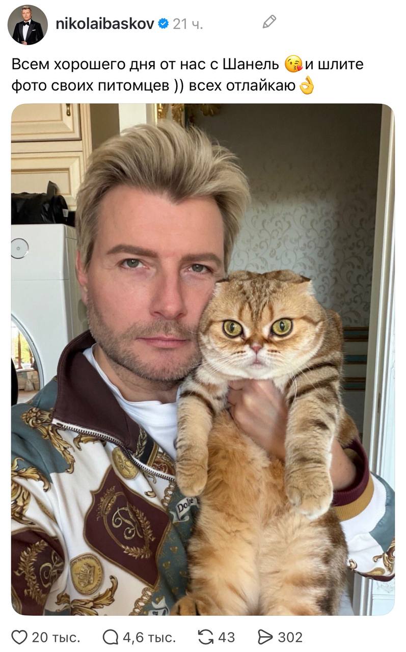 Ну что, дорогие любители питомцев и фанаты Баскова, готовьтесь к очередной порции слащавости. Николай Басков, известный своими попытками быть актуальным в любой ситуации, решил, что тредс — это идеальная площадка для демонстрации своей любви к животным. Да-да, теперь вы можете наслаждаться фотками его пушистых (и не очень) друзей в одном месте. Потому что, очевидно, мимими-контент — это то, чего всем так не хватало в этом мире.